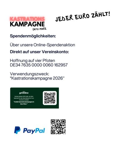 Jeder Euro hilft, die medizinische Versorgung und die Unterbringung dieser geretteten Seelen langfristig zu sichern. Lasst uns zeigen, dass sie nach der Hölle von Slobozia nun endlich auf der Sonnenseite des Lebens stehen dürfen.